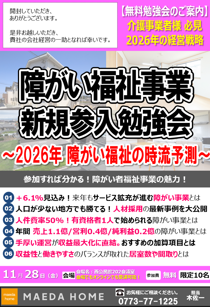 介護事業者様へは、障がい福祉事業への参入勉強会として、開催いたします。